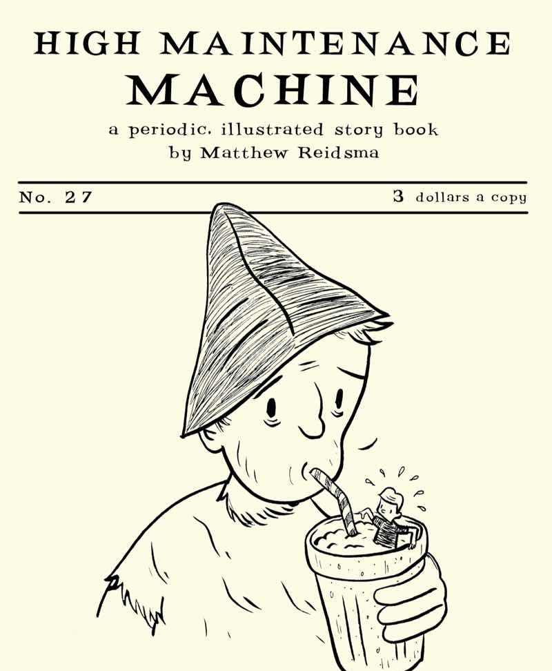 Issue 27 of High Maintenance Machine, a periodic, illustrated story book by Matthew Reidsma. Featuring the story "Milkshake" about baptism, milkshakes, Ripley's Believe it or Not, and Danish bog mummies.